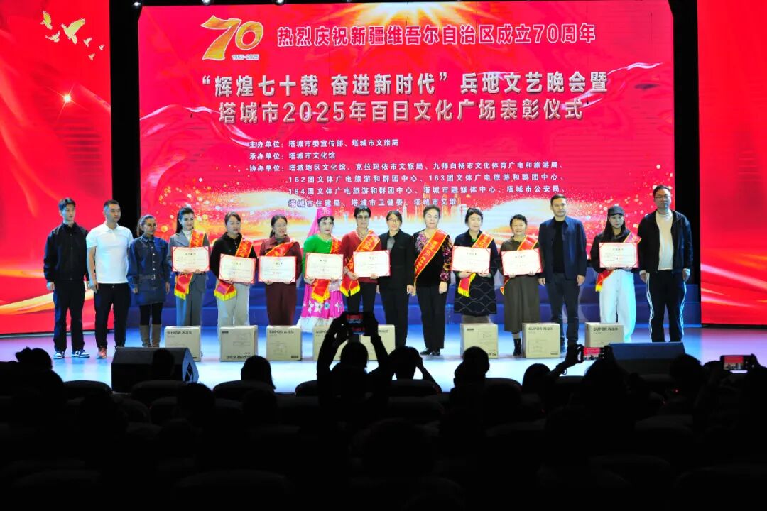10月11日,“辉煌七十载 奋进新时代”兵地文艺晚会暨塔城市2025年百日文化广场表彰仪式在地区文化馆小剧场举办,为观众呈现文化盛宴,共庆新疆维吾尔自治区成立70周年。