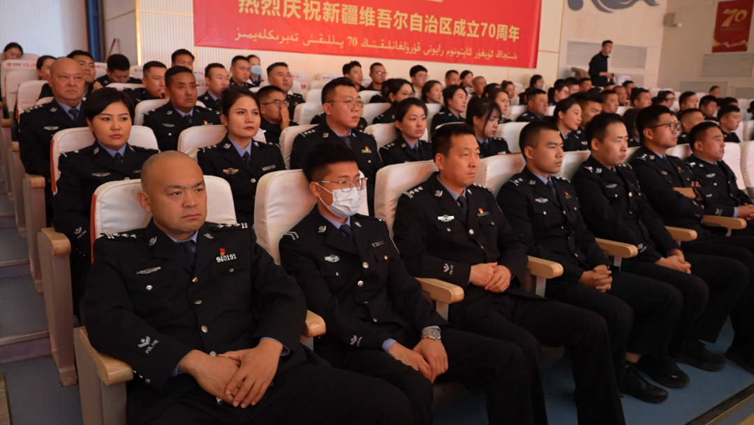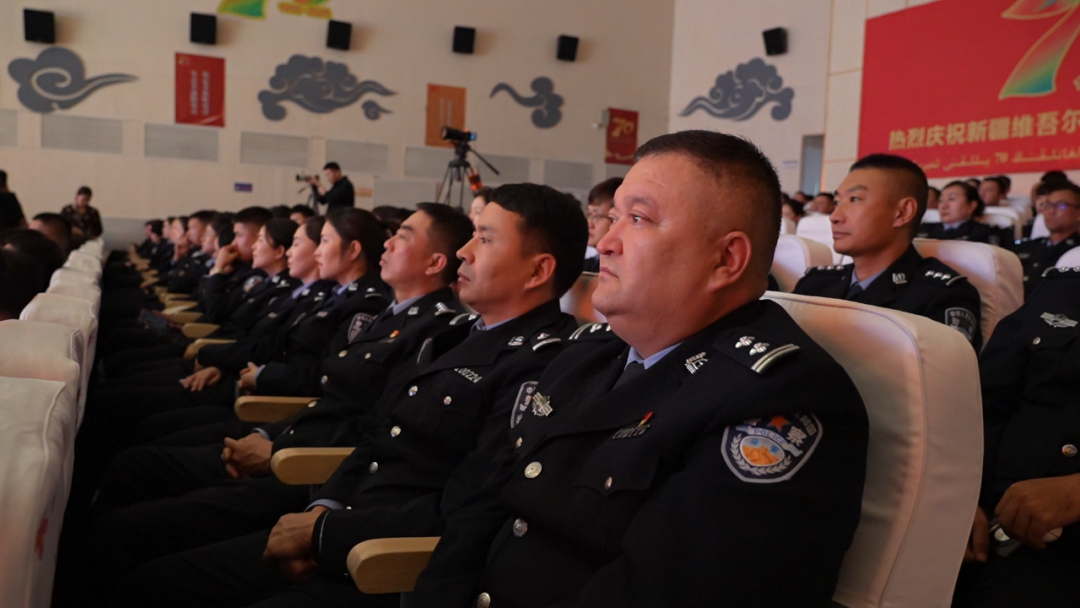 在塔尔巴哈台影剧院,塔城地区公安机关民辅警,边境管理支队、巴克图口岸边检支队、退休老干部代表等成员等齐聚一堂,共同回顾新疆公安70年来的光辉历程,感受一代代公安人忠诚履职、无私奉献的伟大精神。