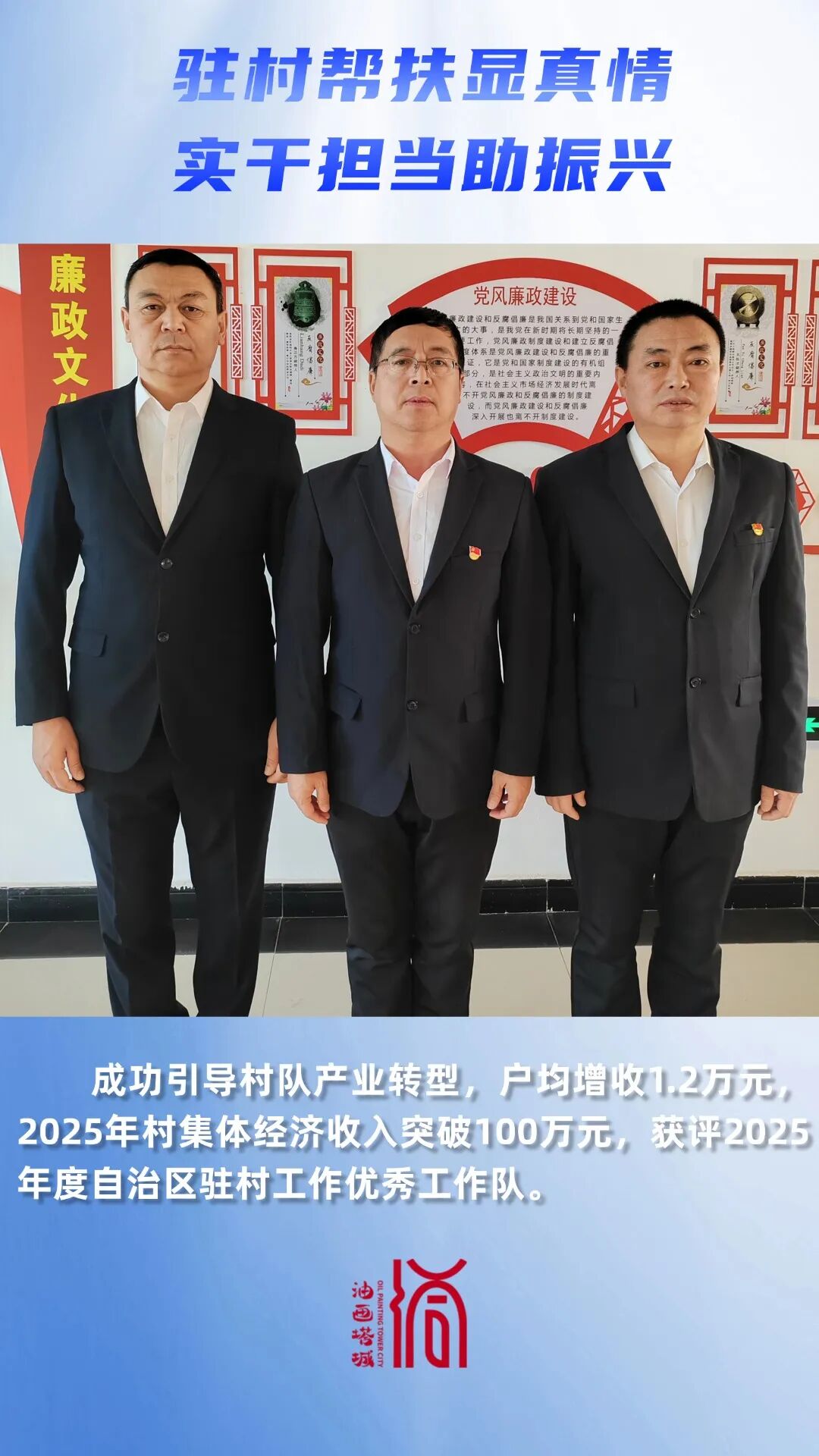精准施策、创新作为,扎实做好“破冰、造血、凝心”三篇文章,成效显著;推动全村国家通用语言普及率由不足40%跃升至98%以上;成功引导村队产业转型,牲畜品种优化改良,庭院经济覆盖率由不足30%提升至90%以上,户均增收1.2万元,2025年村集体经济收入突破100万元;典型经验做法在自治区驻村工作会议上进行书面交流,获评2025年度自治区驻村工作优秀工作队。