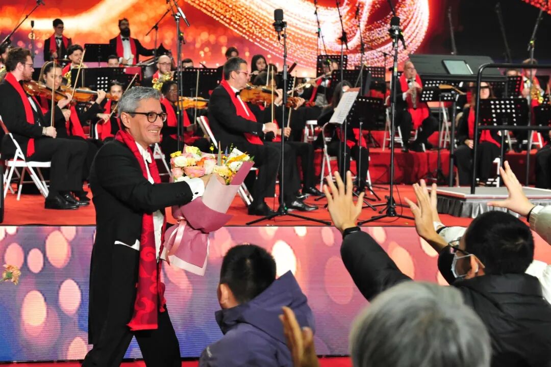 男高音歌唱家多明戈·斯塔西热情的表演。音乐会的曲目编排独具匠心,从恢弘壮阔的交响合奏到温柔婉转的独唱段落,旋律时而激昂如潮,时而婉转如诗,每一个音符都精准叩击观众心灵,当《春节序曲》等中国经典曲目旋律响起,瞬间引起现场观众的情感共鸣。指挥艾利斯奥·卡斯特侬时而轻快如蝶舞,时而转身面向观众,挥手致意、亲切互动,温暖的笑容极具感染力,台上台下连成一片欢乐的海洋。