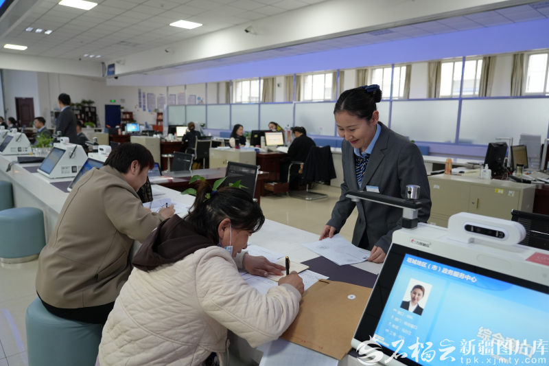 在塔城地区政务服务与公共资源交易中心,工作人员为群众办理业务。马合巴勒·木尔扎汗摄