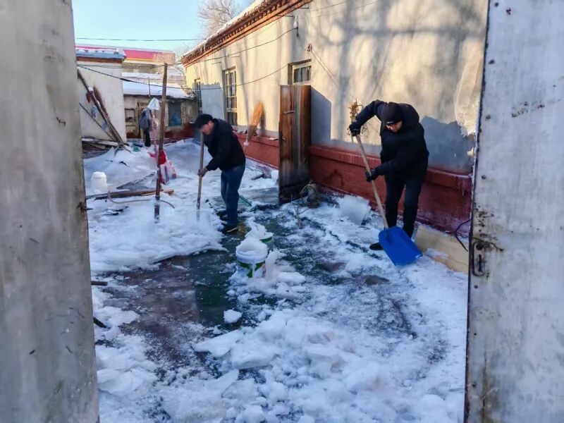 经过5小时奋战,爱国社区河道周边平房院落、3条主要通道的积冰全部清除,为40余户居民打通安全出行路。