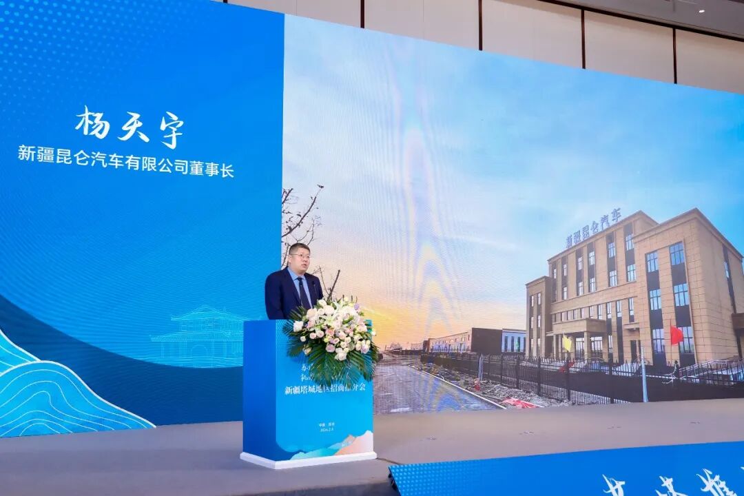 “苏塔携手兴丝路 机遇共享赢发展”新疆塔城地区招商推介会项目签约仪式上新疆昆仑汽车有限公司董事长杨天宇发言。