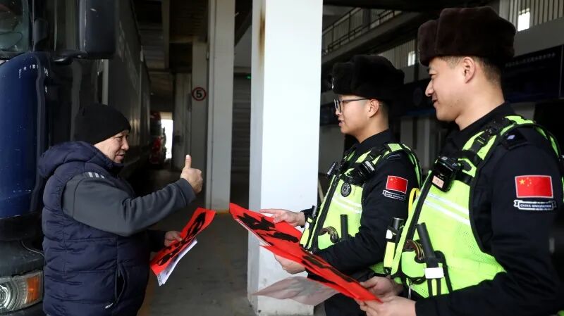 巴克图出入境边防检查站民警给出境货车司机送福字。