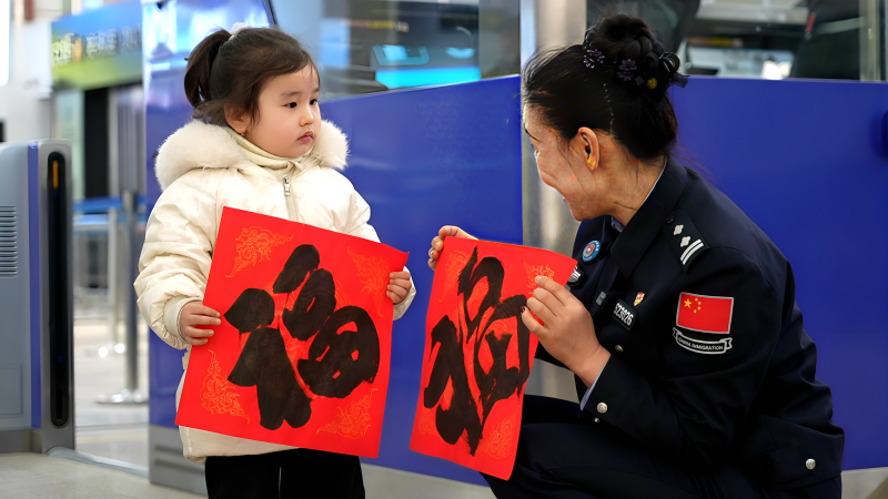 作为中哈人文交流的重要驿站,大厅依托“国门送福”活动,让通关过程成为文化交流的契机。执勤民警在高效办理通关手续的间隙,化身文化使者,向中外旅客送上兼具传统韵味与丝路特色的福字、春联,耐心讲解春节贴春联、送福字的传统习俗。让中外旅客在感受新春喜庆的同时,增进彼此文化认同。