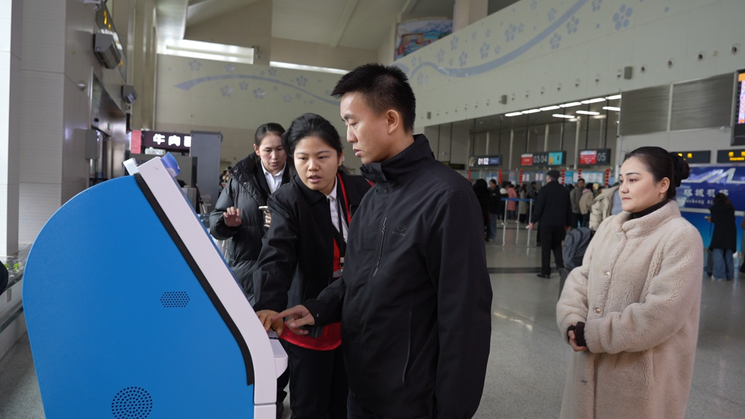 塔城千泉机场工作人员协助旅客取票。
