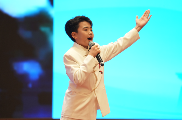 “中华经典诵读大会”(第三季)小学组全国一等奖获得者、塔城少年别克阿尔斯·海拉提别克登上舞台,深情朗诵《读中国》。塔城地区融媒体中心记者阿拉新·素德别力克摄