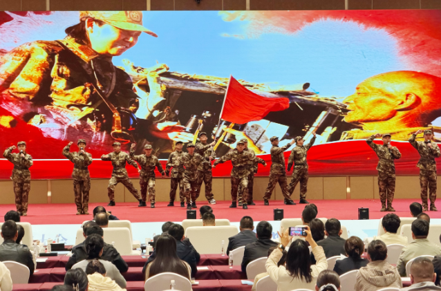 第九师白杨市党委宣传部选送的诗朗诵《英雄》慷慨激昂。塔城地区融媒体中心记者加米拉·加尔肯摄