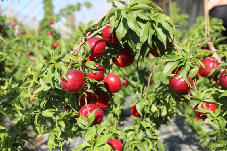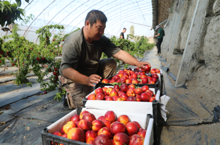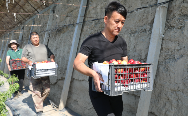 辽宁省农业科学院塔城分院副院长王志刚说:“现在温室里栽培的油桃品种,是2019年从辽宁引进之后,通过筛选确定的比较适合当地栽培的(北冰洋之星、中油4号)品种。现在整个品质和产量表现都比较优秀,甚至在这里栽培出来的品质,比在辽宁种的还要好,它的可溶性固形物含量可以提高2—3个百分点。”