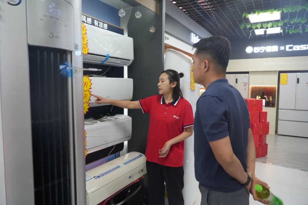 5月17日,在塔城市京东家店,各类商品上都醒目地标注补贴后的价格,店员耐心地向顾客解释“夏日消费季·以旧换新惠民补贴”相关补贴政策,帮助顾客选择心仪的电器。