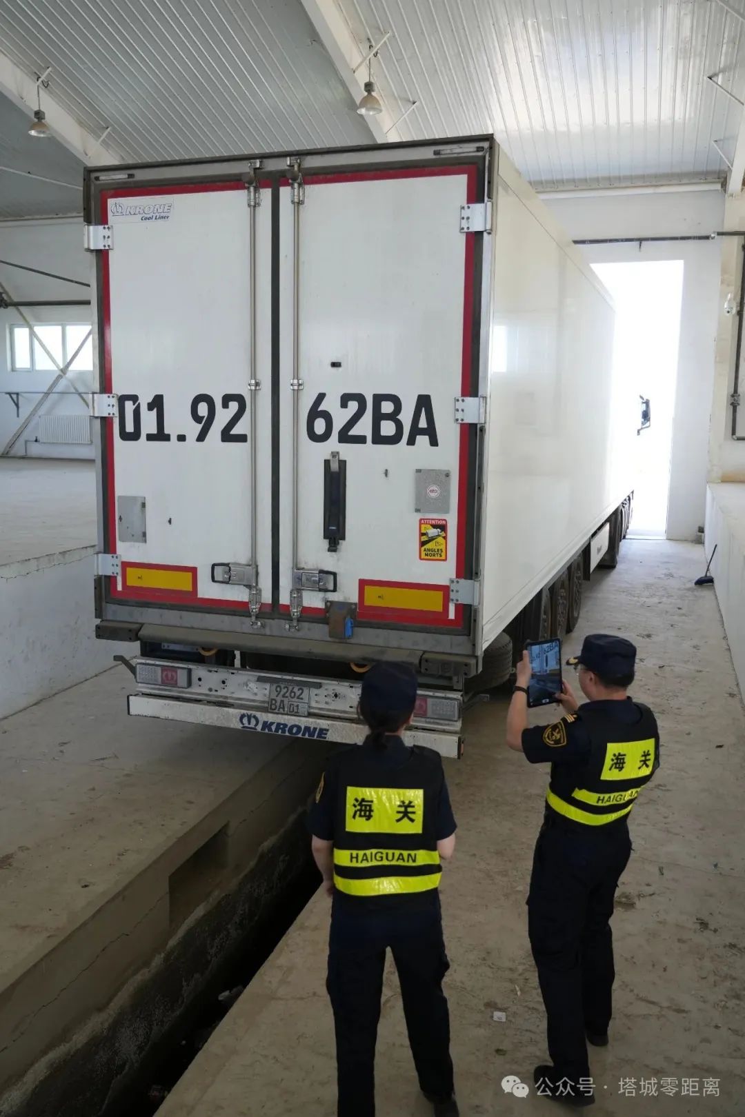 塔城海关工作人员查验塔城市永利商贸有限责任公司将要出境的货柜车辆。塔城地区融媒体中心记者马合巴勒·木尔扎汗摄