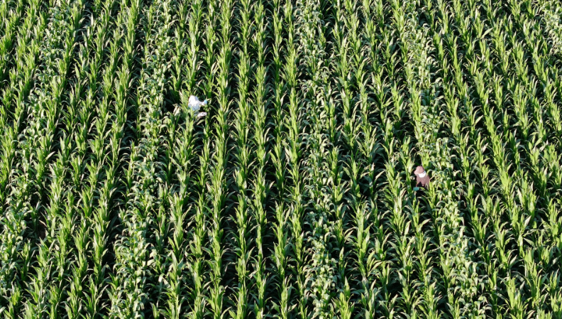 从高空俯瞰,工人们在沙湾市东湾镇东湾村的制种玉米地里进行抽雄作业 常乙 摄