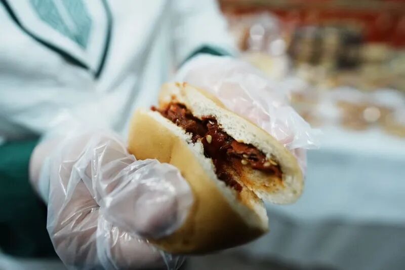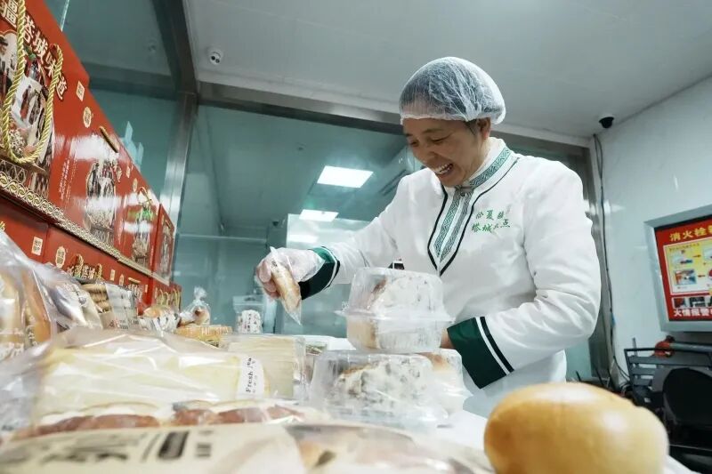 操作间里,新品——“辣皮子面包”的面团正是使用的储绿集团提供的高筋面包粉制成。“塔城本地的优质面粉,是我们进行风味创新的最佳画布。”师傅一边揉面一边说,“它吸水性强,延展性好,能很好地承载我们添加的各种本土特色食材,而不失面包应有的结构。”恰夏疆醇面包坊销售负责人李霞拿着“辣皮子面包”笑着说。