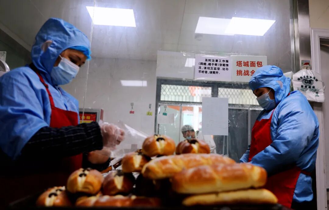 新疆三奕商贸有限公司员工在包装车间分包面包。