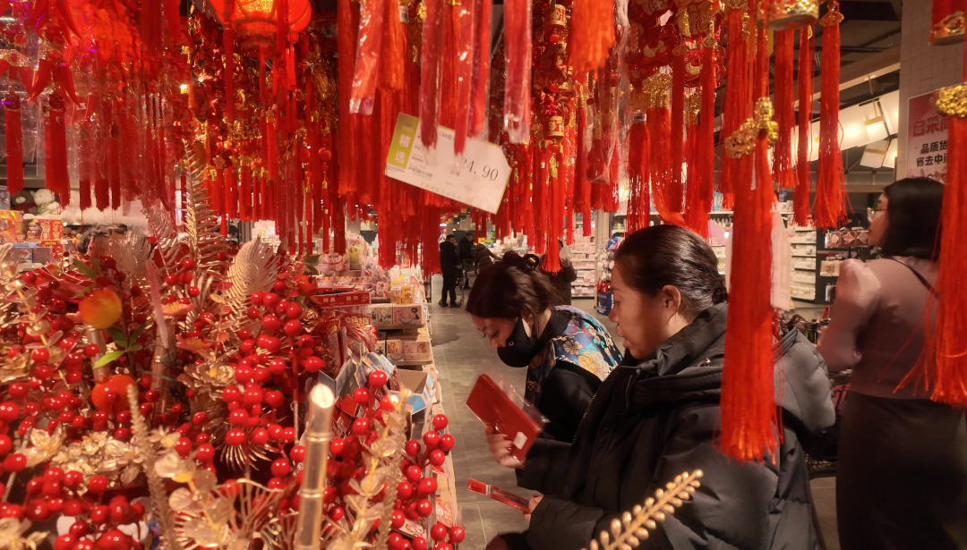 塔城市卓悦超市里多种商品换上喜庆红色包装,从传统对联、福字、灯笼,到现代零食大礼包、精美礼盒,品类丰富,满足不同消费需求。