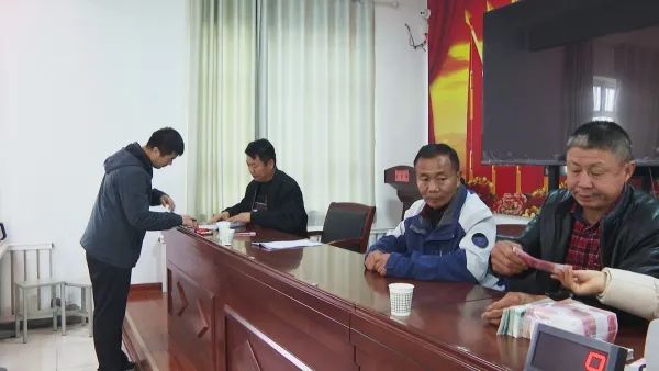 分红大会现场,村干部们认真核对每户股民身份、股数和分红金额,股民们依次签字、按手印,领取自家的分红款,一派欢喜、热闹的景象。