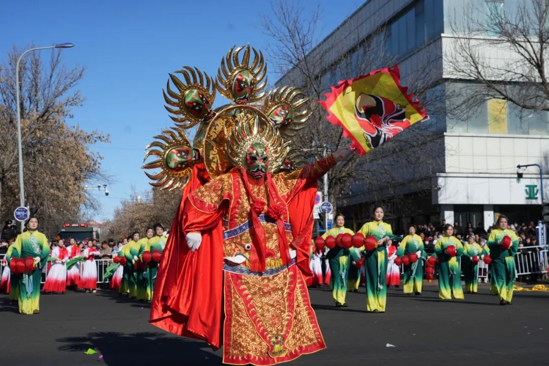 和平街道方队的表演则突出了蛇年特色,身着中国传统服饰的演员们手牵“蛇宝宝”闪亮登场,引起热烈掌声。接着,响环队跳起了响环舞,变幻莫测的中国传统文化变脸,也让人目不暇接。