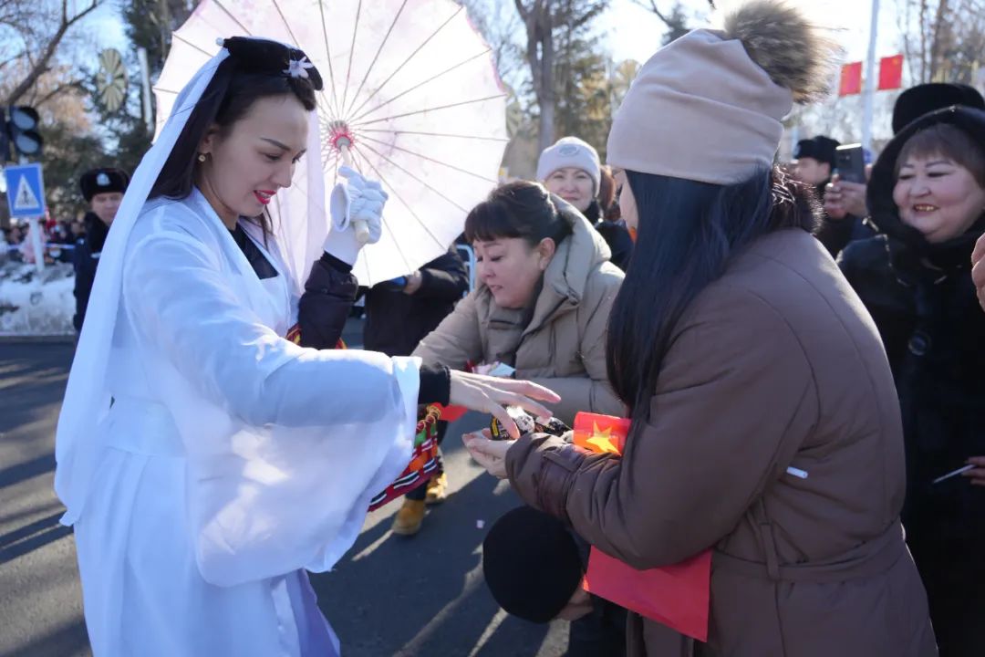 白娘子给观众送糖、送祝福。塔城地区融媒体中心记者代姣美摄