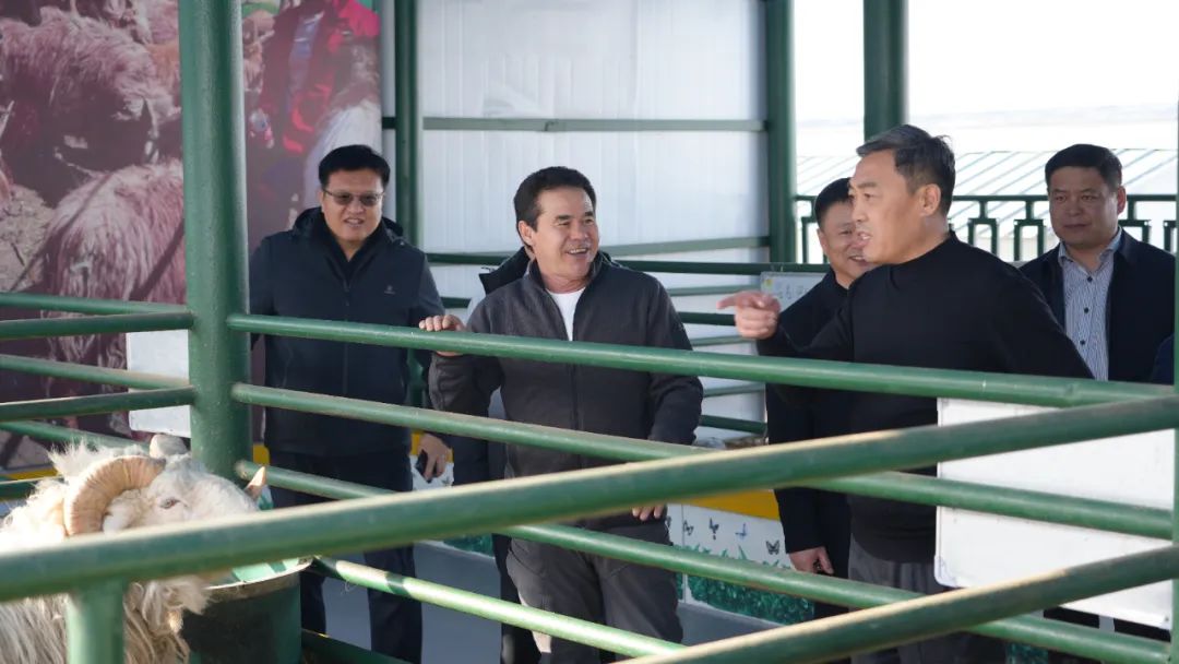 新疆谢利盖畜牧有限责任公司负责人向新疆果业集团领导介绍巴什拜种羊。塔城地区融媒体中心记者王高升摄