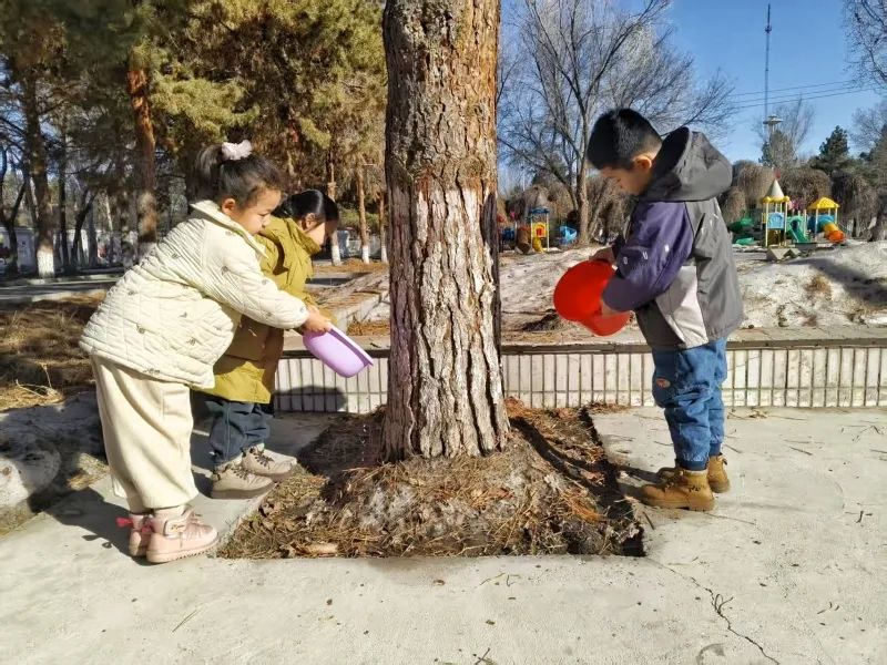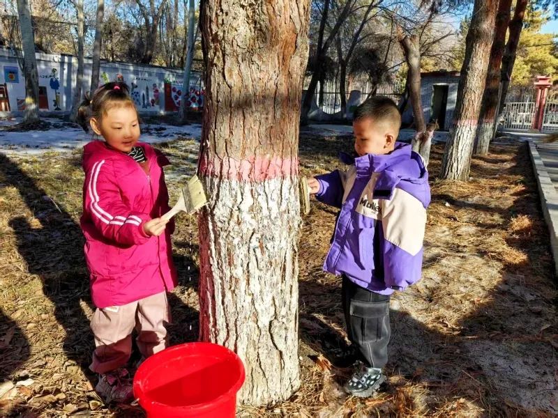 3月10日,乌苏市哈图布呼镇中心幼儿园开展了“萌娃暖心护树、劳动绽放光荣”植树节主题活动,孩子们化身“绿色小卫士”,在老师的指导下,拿着小刷子,蘸上白灰水,细心地给树木刷上白灰,为小树穿上“防护衣”。一株株新栽的树苗迎风挺立,成为校园里最温暖的风景。