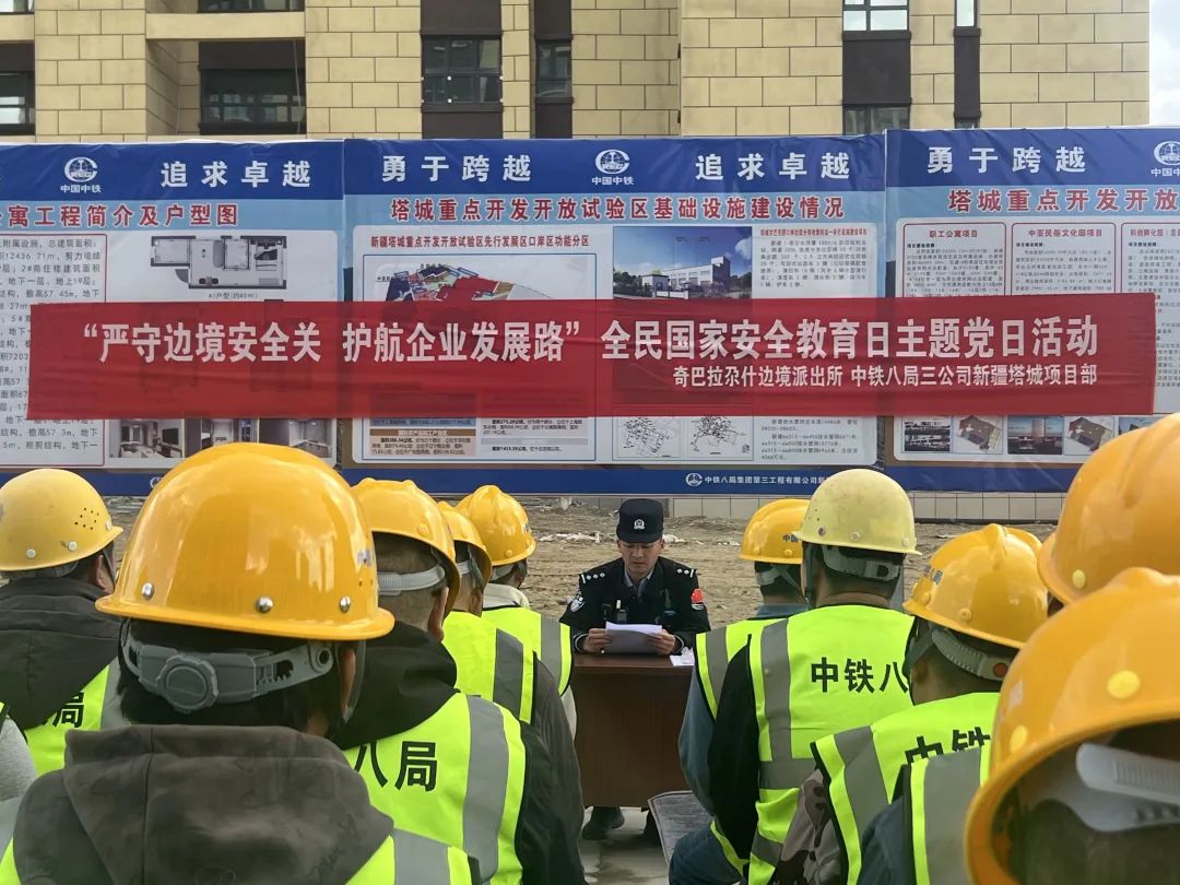 4月14日,在第十个全民国家安全教育日到来之际,新疆塔城重点开发开放试验区建设工地上,一场由塔城边境管理支队奇巴拉尕什边境派出所和中铁八局三公司新疆塔城项目部联合举办的普法教育活动在火热进行。