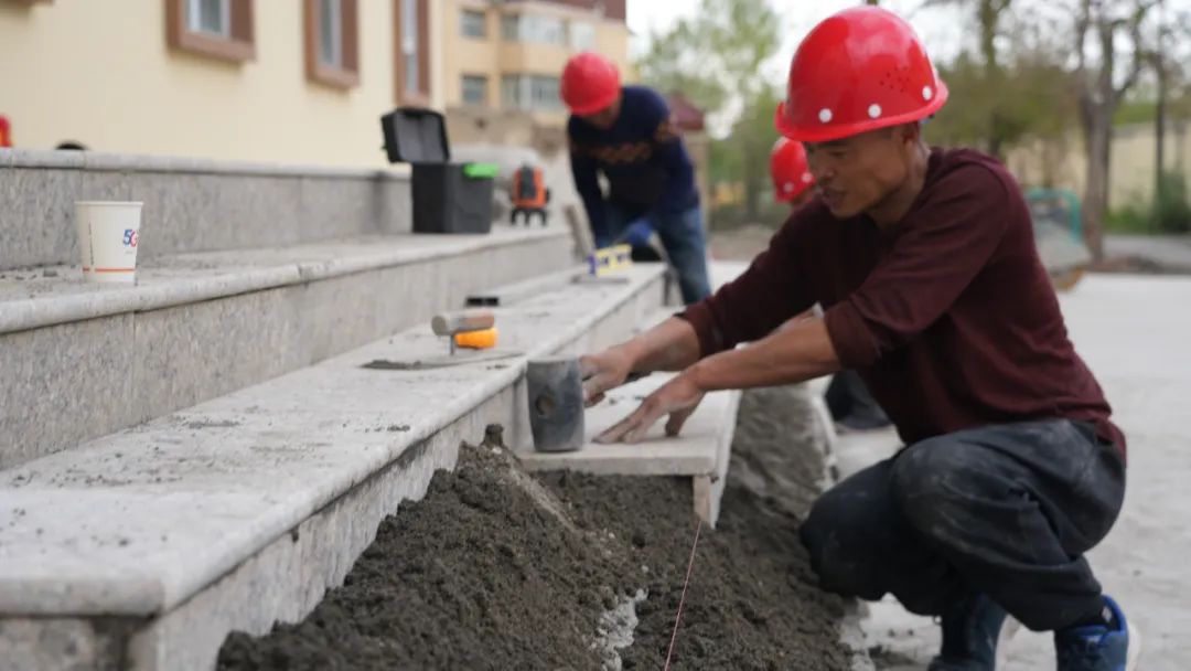 施工人员在砌台阶。塔城地区融媒体中心记者 王高升摄