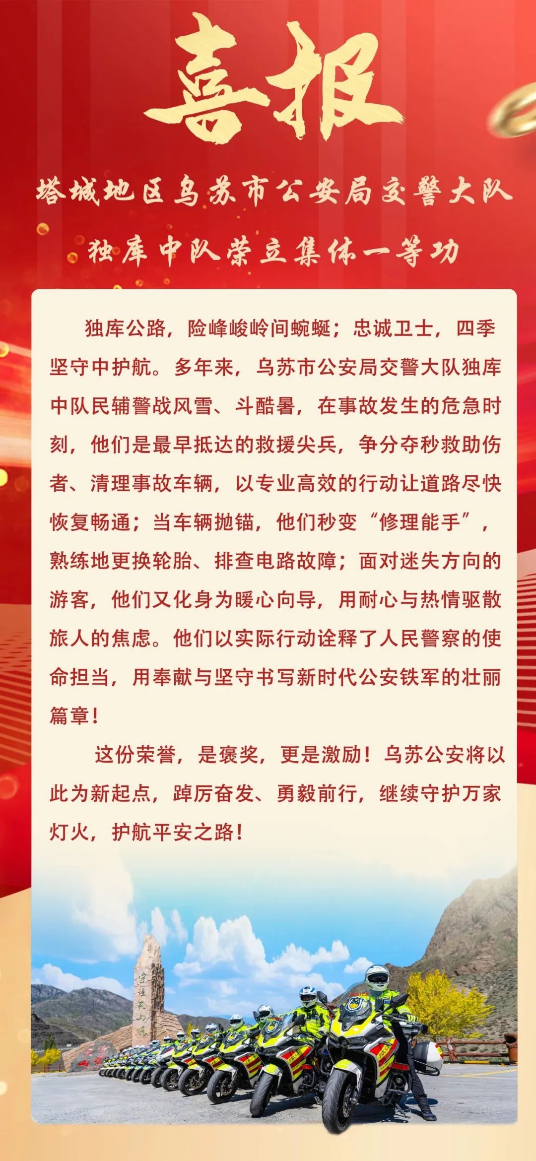 喜报!塔城地区乌苏市公安局交警大队独库中队荣立集体一等功