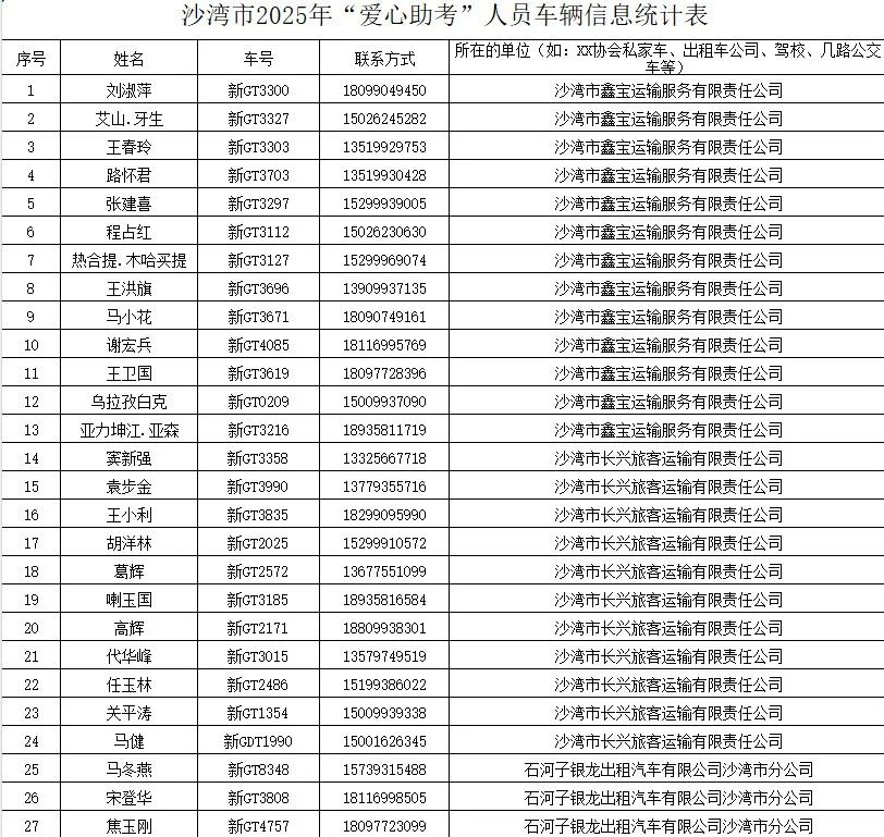 为了助力沙湾市考生顺利应考,今年,沙湾市市精心筹备的爱心送考活动再次温暖启程。快来看看都有哪些温暖的名字,他们将成为考生奔赴梦想途中的坚实依靠 。