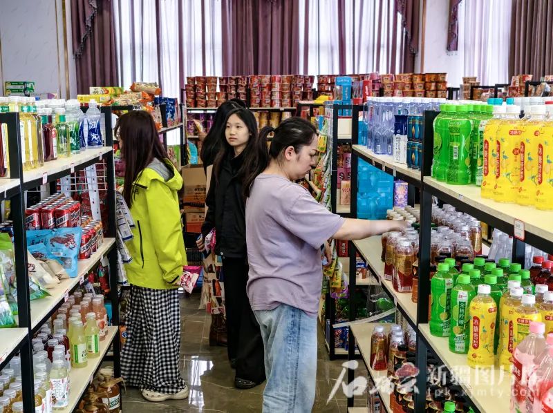 6月27日,游客在“乌苏驿”旅游多功能综合服务中心里的一家超市购物。