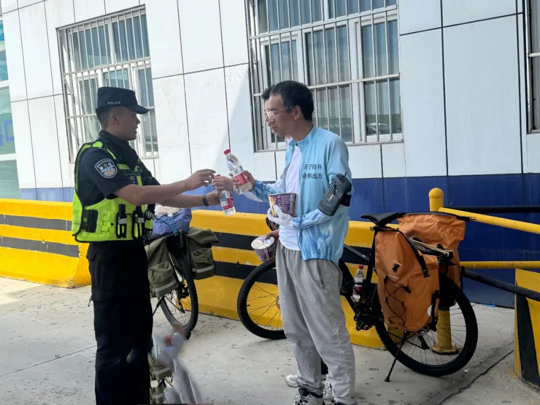 7月10日下午,塔城边境管理支队拉巴边境派出所执勤民警接到求助,两名骑行新疆的上海游客,因长途奔波赶路,导致饮用水和干粮用尽,向派出所执勤民警寻求帮助。