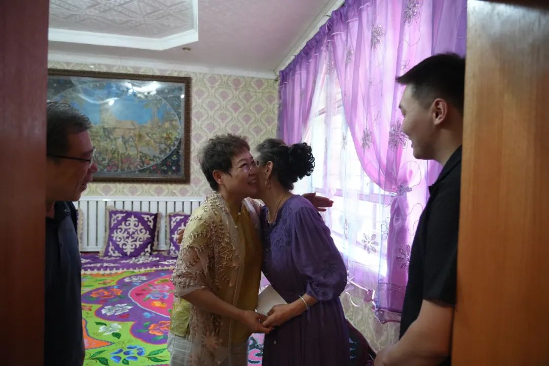 冯金友刚推开车门,热浪中熟悉的香气让他恍惚回到了2011年7月,还没等他站稳,吾恩哈尔便张开双臂欢迎拥抱,阿依古丽随后手捧着哈萨克族传统花帽、围巾,为夫妇俩一一戴上。