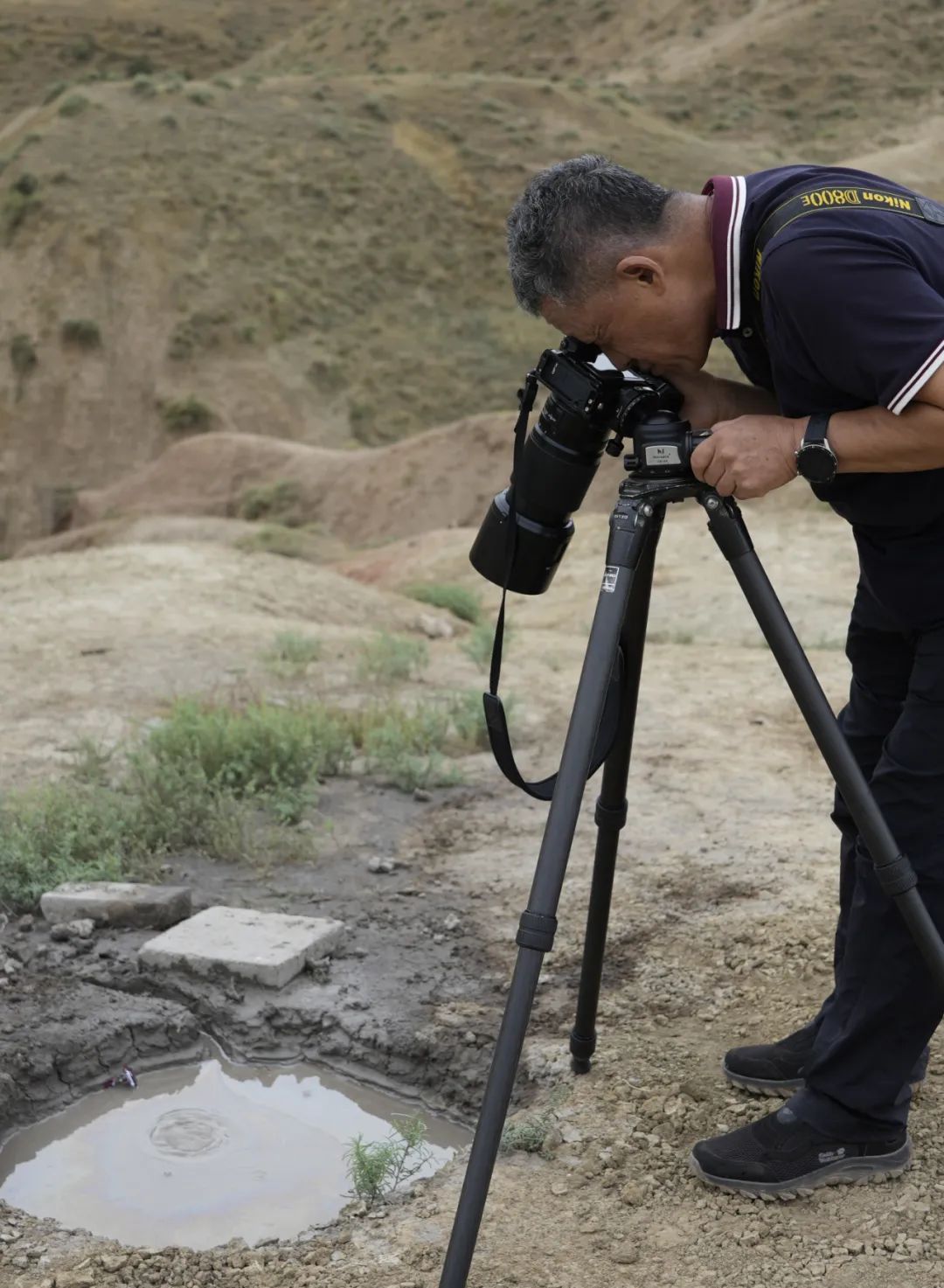 正在全神贯注拍摄泥火山的记者。