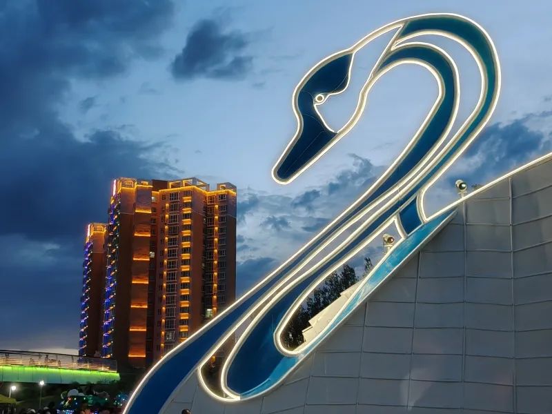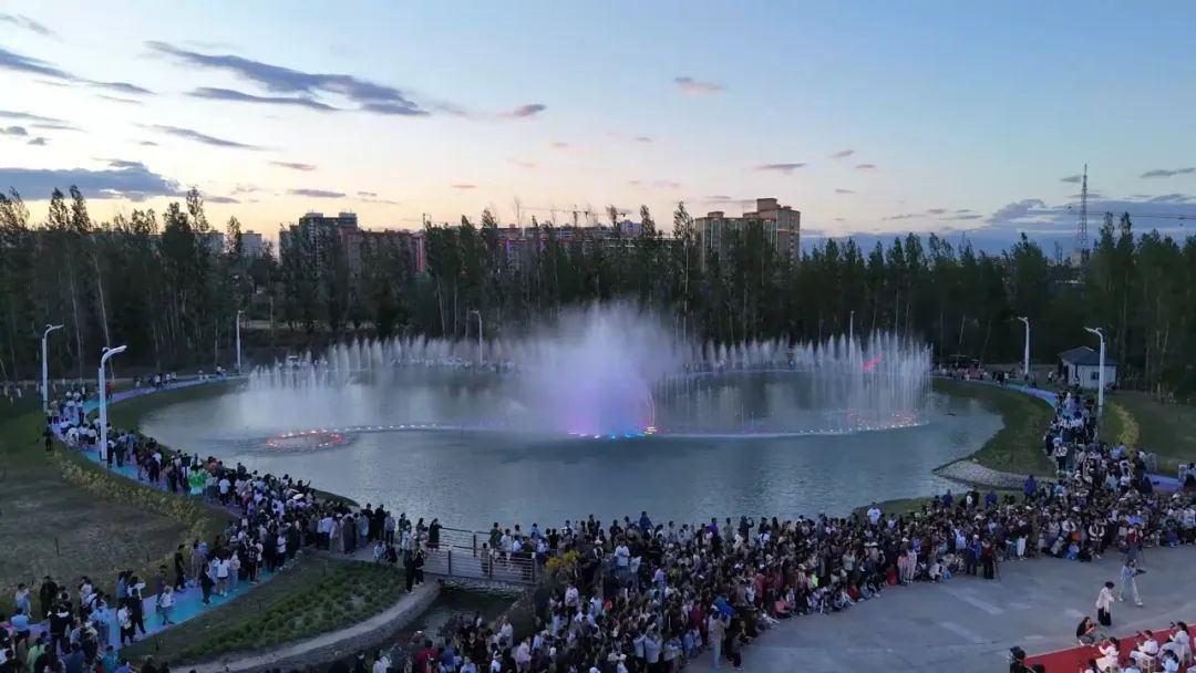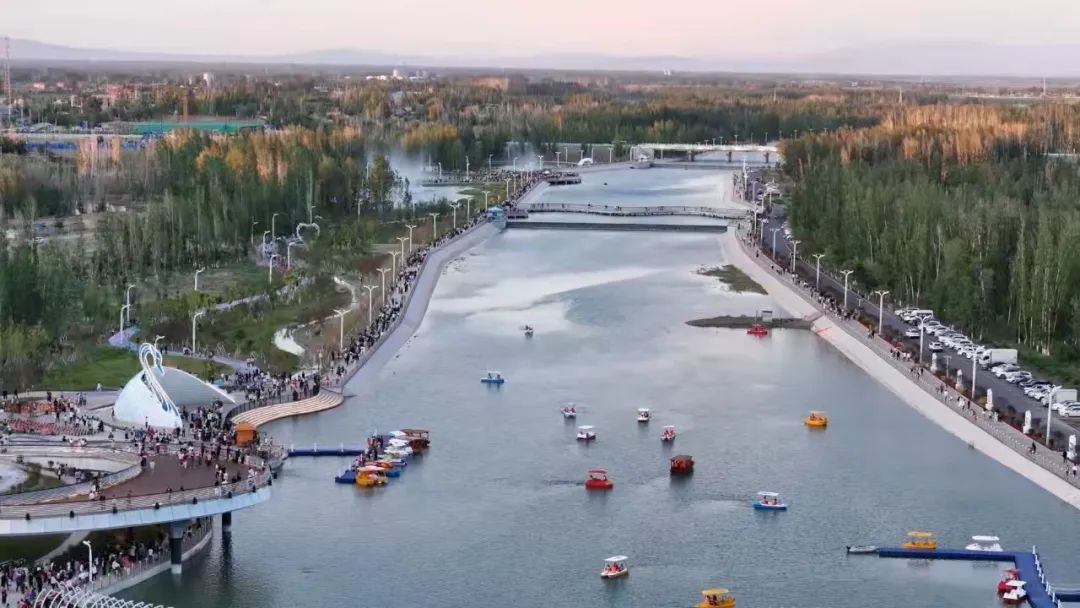 傍晚时分,额敏县滨河公园热闹非凡,天鹅湖观景台游人如织、水上乐园游船往来、音乐喷泉水幕电影流光溢彩。