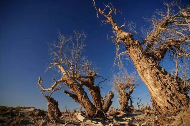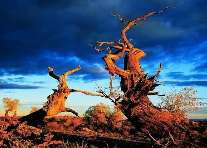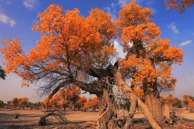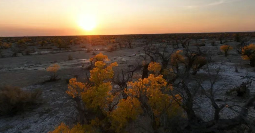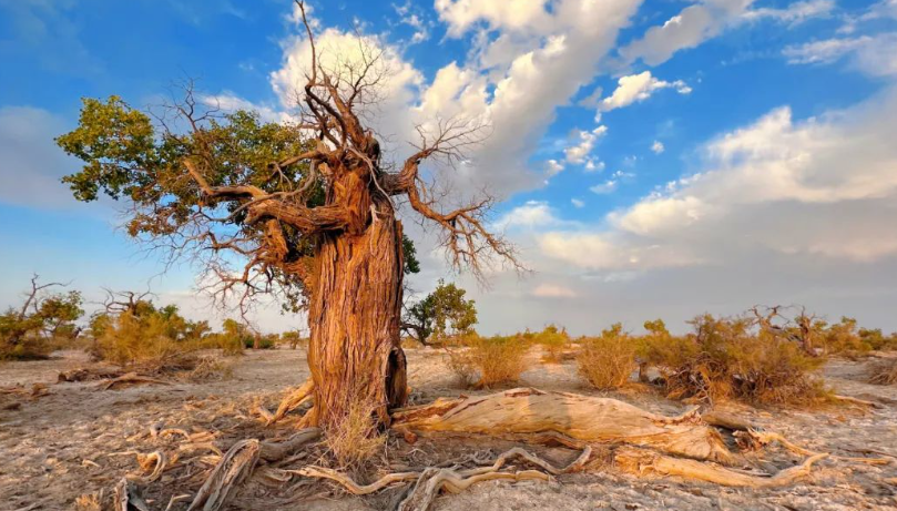 在古尔班通古特沙漠边缘,和布克赛尔县查和特乡被一片广袤的天然金胡杨树林温柔环抱。这片在风沙中挺立的“金色屏障”,不仅为当地铺就了亮眼的生态底色,更以坚韧不拔的姿态,将胡杨精神深植于水土之间,书写着荒漠与绿洲交织的生态篇章。