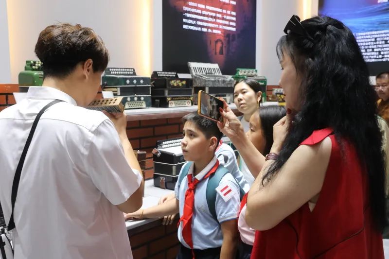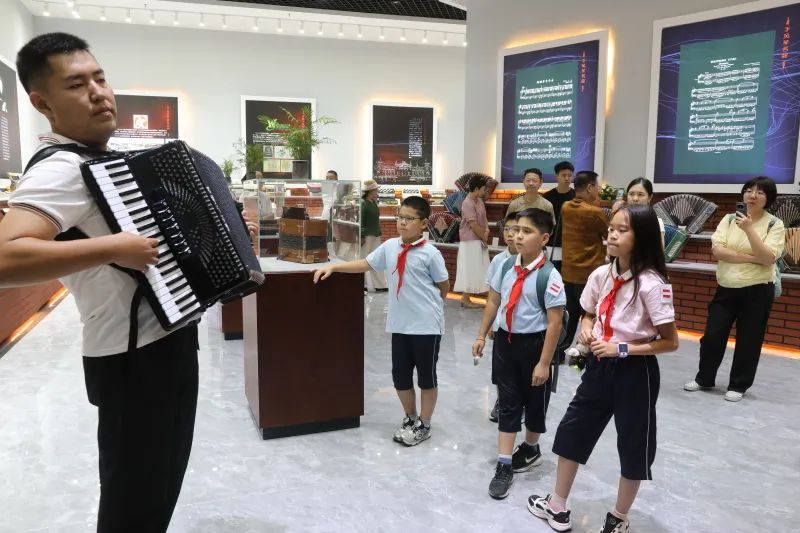 在塔城市手风琴文化展示厅,馆内数千架来自世界各地的手风琴吸引了同学们的目光,手风琴爱好者现场弹奏的美妙琴声,让同学们真真切切地感受到了塔城作为手风琴之城的魅力,各式各样的精美手风琴在同学们心中留下了深深的印象。