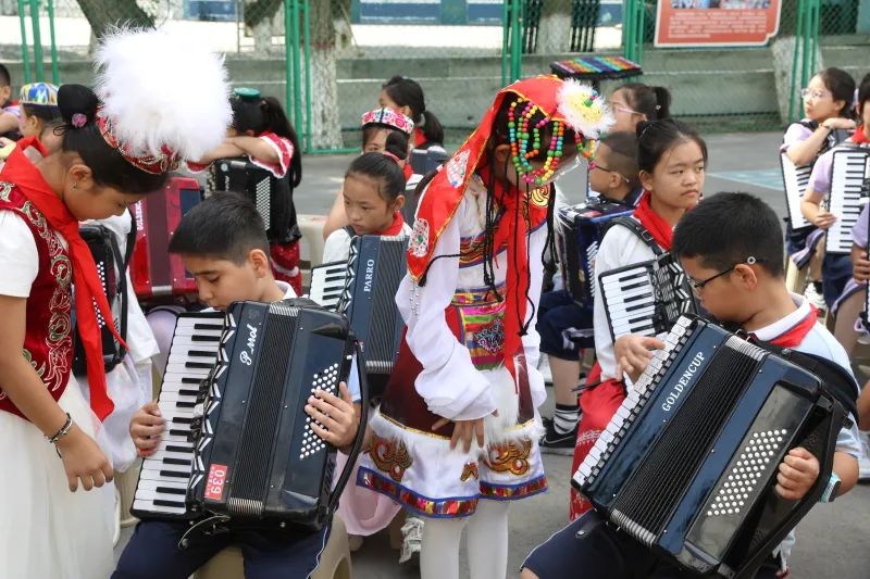 在塔城市第三小学体验手风琴弹奏。