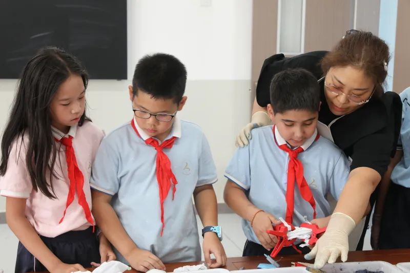 在互动环节,同学们分别来到裕民县第三小学和塔城市第三小学,携手体验扎染非遗技艺,走进少年科学院,探索科技奥秘,激发创新思维。与老师们现场制作丁香花样式的饼干、紫薯糕,学拉手风琴,并开展互动交流演出和礼物交换环节。作为石榴籽项目代言人于宝宝同学一行向裕民县第三小学和塔城市第三小学的学生介绍了北京的三山五园的风光,还给同学们精心准备了一批书籍赠予同学们,鼓励他们勤奋学习、传承文化、共筑中国梦。欢快的节奏与和谐的氛围,让现场充满欢声笑语,展现了民族团结的温馨画面。