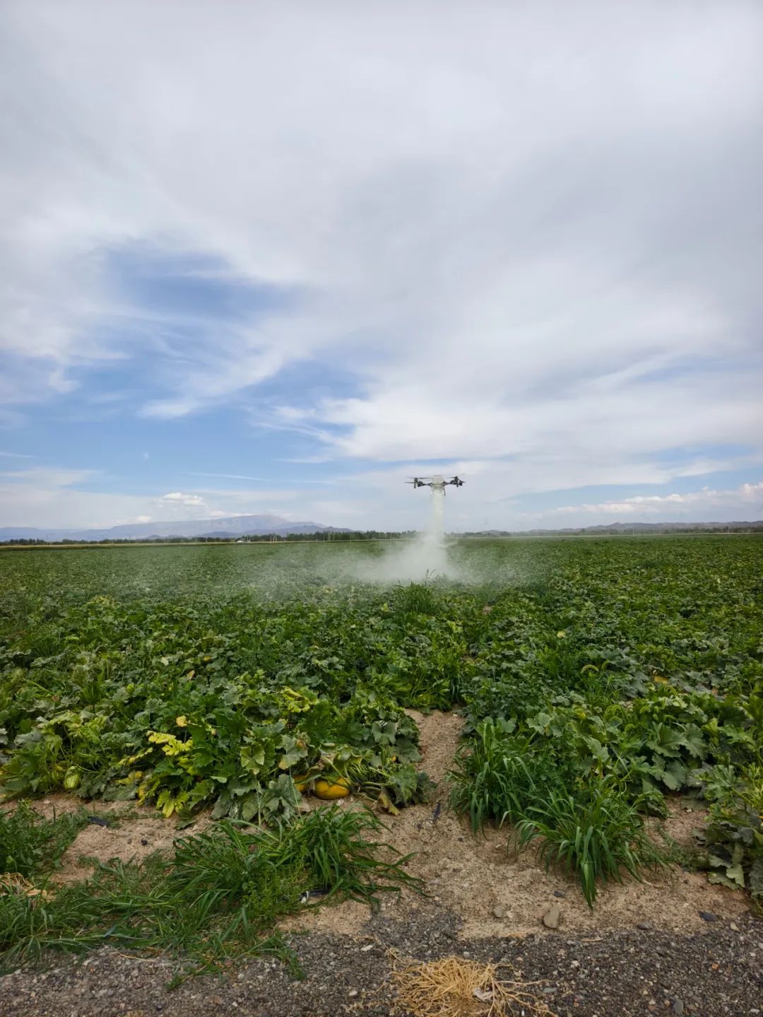 裕民县阿勒腾也木勒乡吉也克齐村利用无人机帮助农户打药。