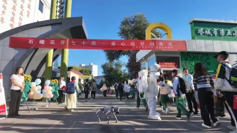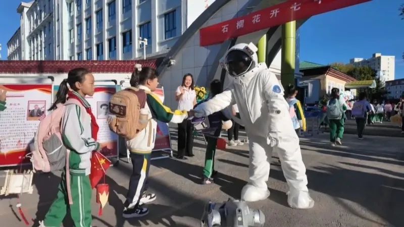 在塔城市第五小学,处处洋溢着浓厚的开学氛围。校门口,映入眼帘的是穿着宇航服的“大朋友”和“小朋友”握手,脚下银色机械狗也跟着凑趣,热情地迎接学生们的归来。一声声亲切的问候,一张张灿烂的笑脸,让整个校园充满了温暖。