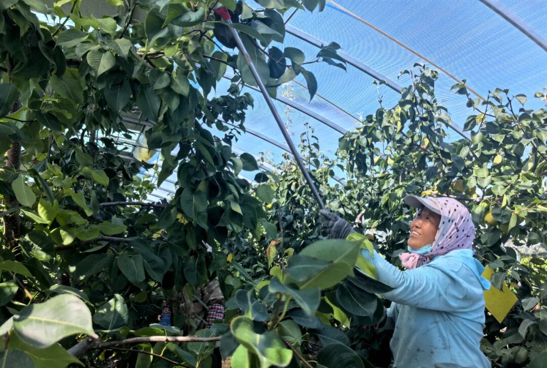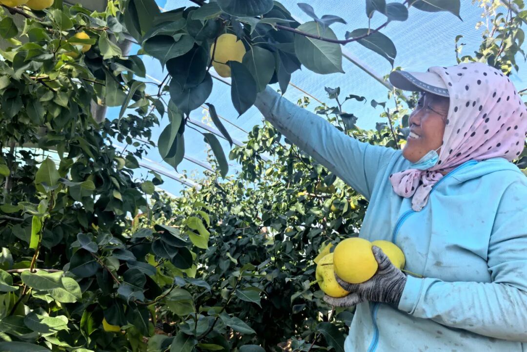 当日,在夏孜盖乡致富带头人岳永河承包的大棚内,饱满的梨子挂满枝头,采摘工人窦平安一边麻利地装筐,一边笑着说:“这梨长得好,摘着心里都甜!”