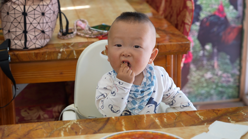 小朋友品尝大盘鸡,吃得津津有味儿。