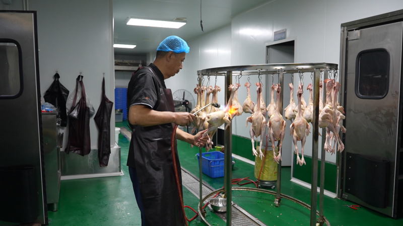记者来到新疆味美达中央配送大厨房。操作间内,环境干净整洁,功能区分区明确,每只食材鸡腿上挂着“溯源二维码”。工作人员剪掉食材鸡脚指甲,用喷火器材去除食材鸡毛。标准化筛选机制,为大盘鸡产业提供放心食材。
