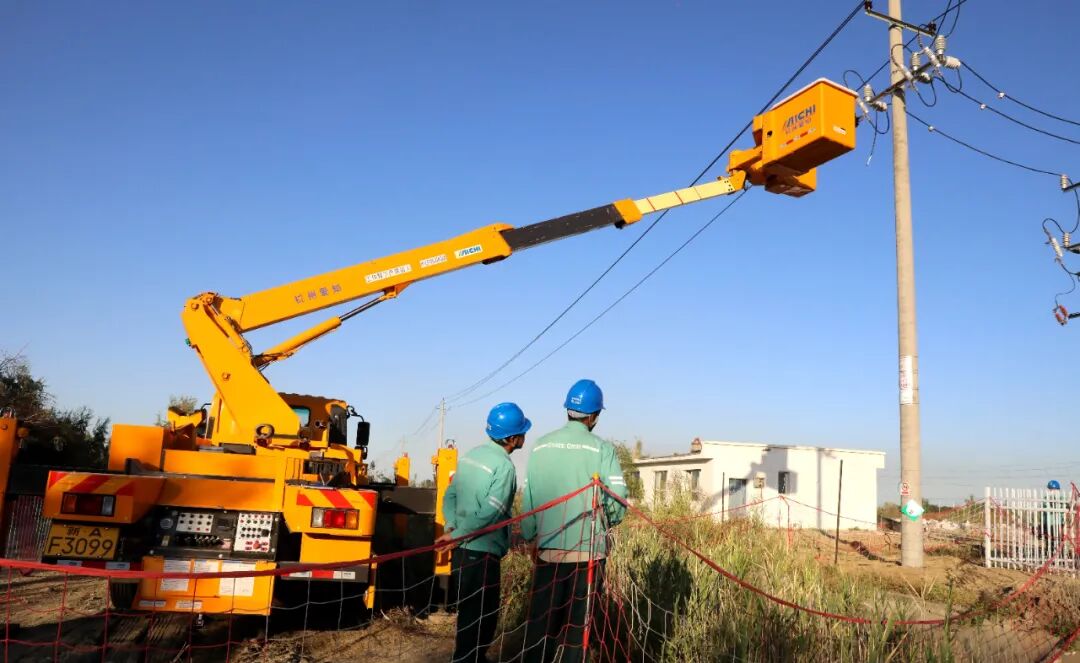 电力工人操作升降臂。