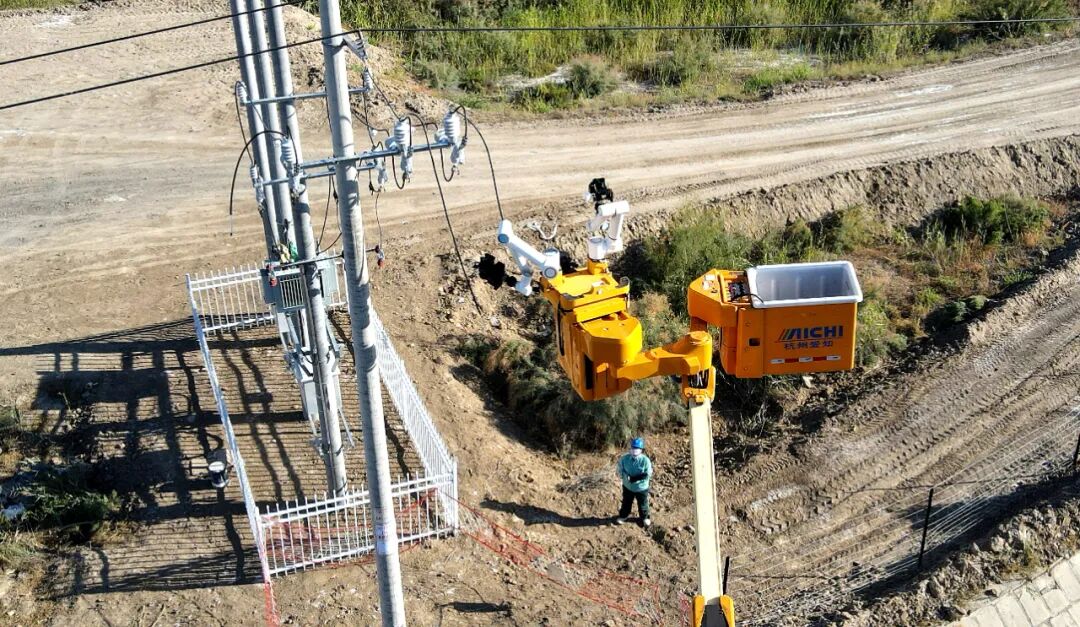 9月4日,在沙湾市金沟河镇10千伏丰荣线接引流线工作现场,一台搭载于绝缘斗臂车上的双臂自主带电作业机器人平稳升起,精准完成引线搭接任务。带电作业机器人站上供电保障岗,在提高电力工人安全系数的同时,也提高了供电设施维护检修的效率。