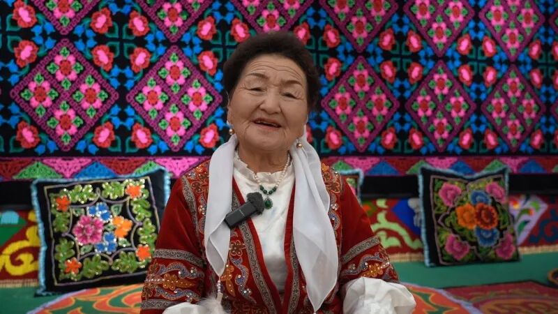 “明星奶奶”加恩丽·孜吾肯正在接受采访。