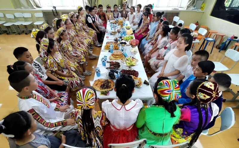 古尔邦节、端午节、肉孜节、中秋节等节日是沙湾市第二小学开展民族团结进步教育的重要载体,学校将这些节日与丰富多彩的文化娱乐活动紧密结合,开展“你到我家吃馓子,我到你家吃月饼”活动,举办民族团结手抄报、绘画等比赛,让各族学生在活动中拉近距离,建立友谊。