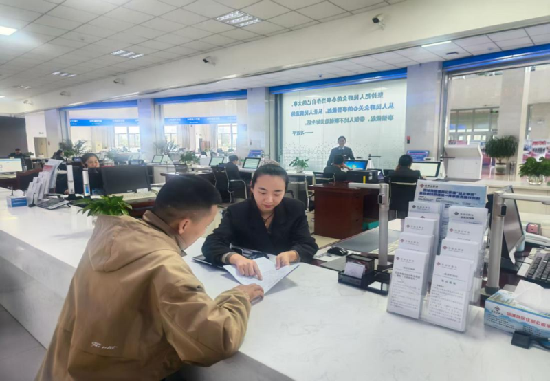 窗口工作人员正在为王先生办理业务。