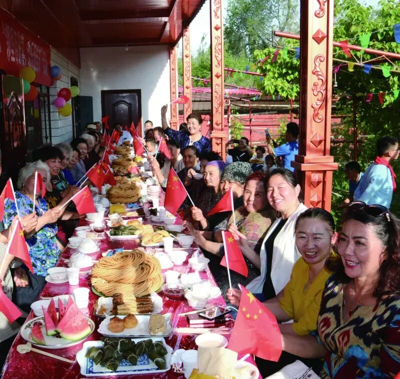 坚持升旗16年的沙勒克江·依明大叔来了,多民族家庭代表黄英、哈力旦·依拉洪来了。随着各族居民陆续到来,各民族特色的美食纷纷摆上长桌。伴随着欢快的手风琴曲,百家宴开席了。