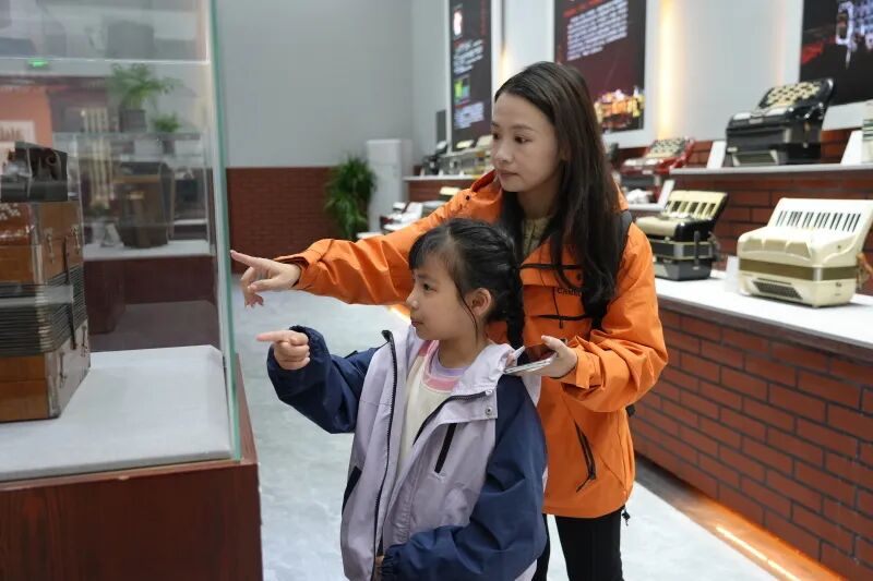 在手风琴展馆里,游客们相互拍照片留念,观赏展馆文创作品,歌舞爱好者听到悠扬的琴声忍不住跳起舞来,现场热闹非凡;在展品陈列区,游客们细致的观摩不同年代、来自不同国家的手风琴藏品,藏品的线条纹里、造型设计让游客们大饱眼福,也满足了好奇心;听了手风琴文化展示厅琴手的精彩弹奏,游客们连连称赞。