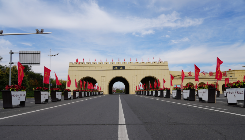 国庆期间,乌苏市城门红旗招展,每日车辆川流不息,五湖四海的游客走进啤酒之都,感受当地的人文历史。